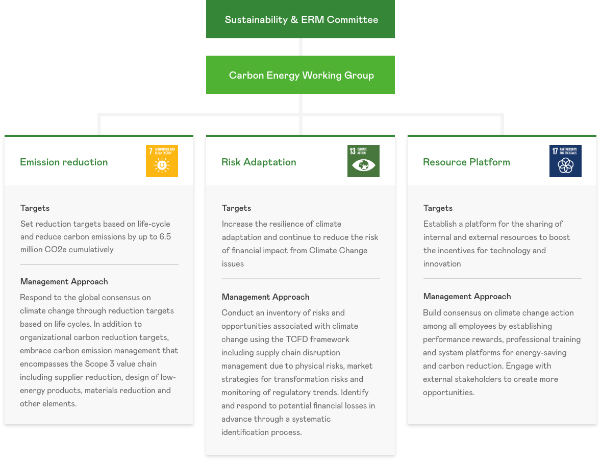 In response to CDP Commit to Action, we pro-actively participate in the CDP investors questionnaire response, and we reported with sincerity and transparency our climate change response measures, including a climate change governance strategy, risk identification and opportunity analysis, information regarding greenhouse gases emission volumes, reduction goals and performance, etc. Concurrently, from 2012 onward, we have concretely responded to CDP water with regard to risks and opportunities presented by global climate change and water resources.